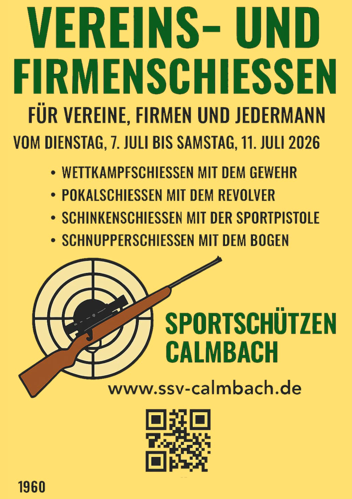 auch in diesem Jahr führt der Sportschützenverein Calmbach 1960 e. V. sein traditionelles Vereins– und Firmenschießen in der Zeit vom 07. Juli bis 11. Juli durch. Wie Sie aus der Vergangenheit wissen, haben hier die Bevölkerung, Vereine und Firmen die Möglichkeit einen Einblick in den Schießsport zu gewinnen und sich mit anderen Mannschaften zu